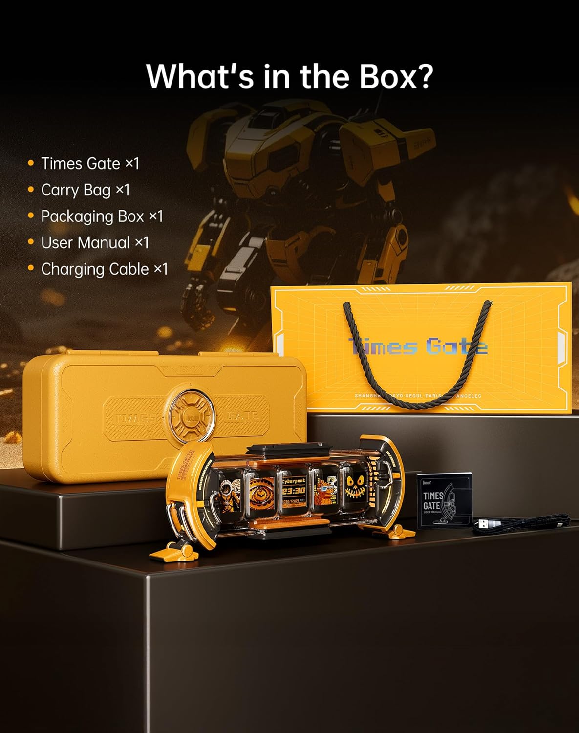 【Divoom Times Gate】 -- The Times Gate Cyberpunk Digital Clock draws inspiration from the realm of future technology, It transcends being a mere digital clock; it is a magnificent tapestry interwoven with light, shadow, and creative expression. featuring five full-color LCD displays, with dazzling 128x128 pixel art and lively animated GIFs, brings a unique visual extravaganza to your gaming room, office.Product dimensions: 283×47× 97mm