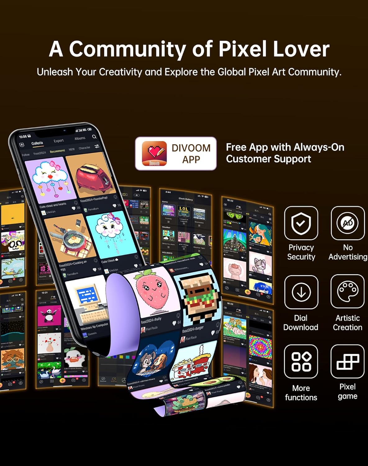 • 【Pixel Art Playground】 -- Unleash your imagination and create personalized pixel art. With a vast library of millions of pixel art designs updated daily, you can effortlessly customize your display with animated graphics, text, and more, it's a canvas that reflects your unique style and creativity. The Times Gate is more than just a cool RGB led display, it's a symbol of the seamless integration of life and technology.