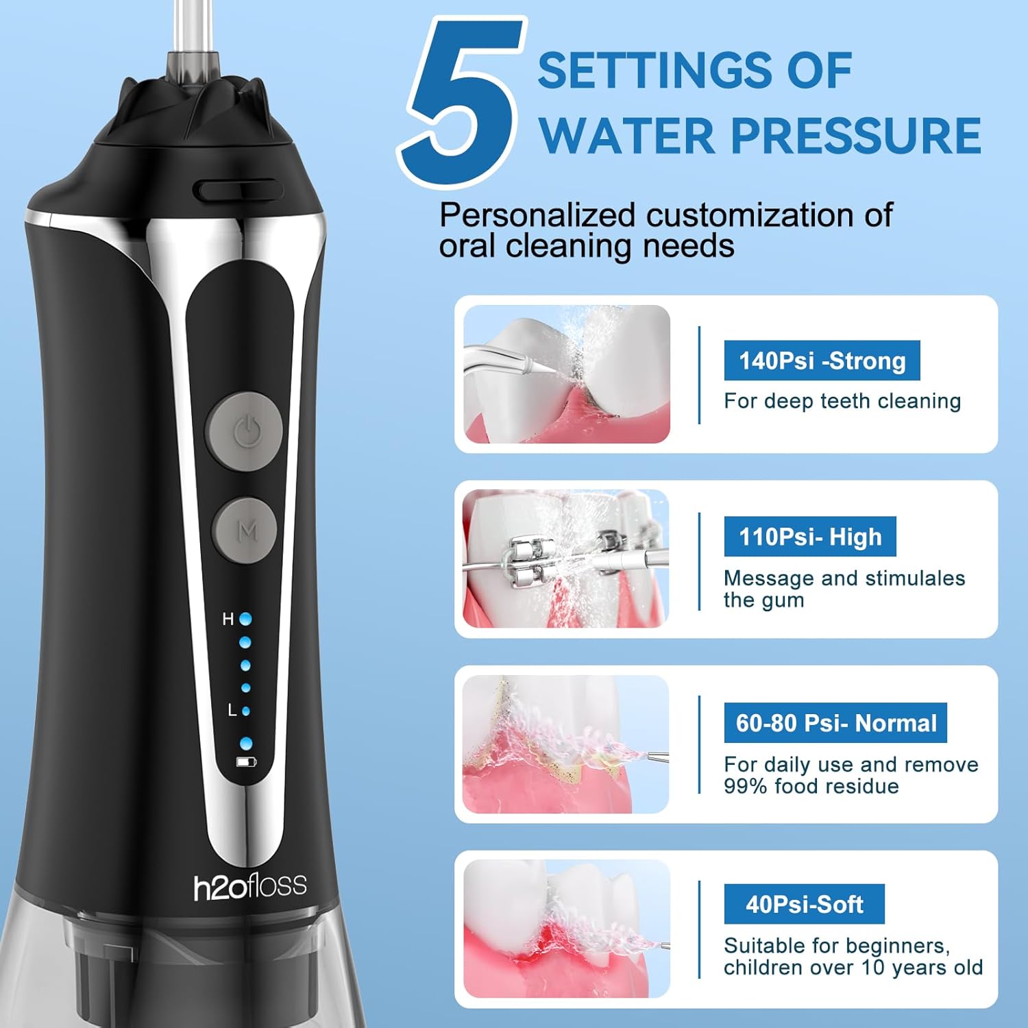 - 【Superior Cleaning and Improve Oral Health】 The h2ofloss water dental fosser provides more effective plaque removal than traditional dental floss. It features 5 settings of water pressure from 20-140PSI, ensuring a thorough cleaning for your teeth and gums. And also with advanced pulse technology, the pulse frequency is as high as 1200 pulses/min, effectively removing 99.9% of stubborn food particles and plaque and solving oral issues like tooth decay, and bad breath.